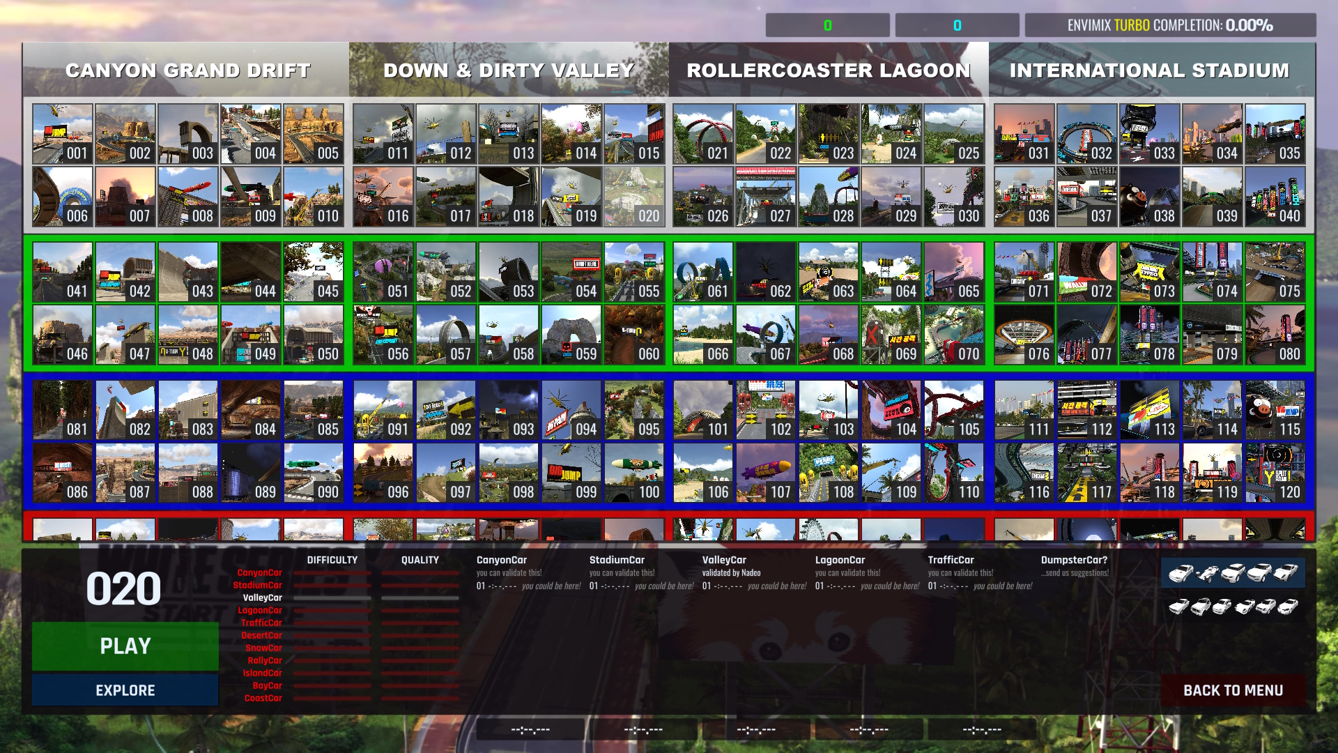 This massive package contains all of the 200 maps from the official campaign to play the envimix challenge on. And also every Trackmania Turbo scenery you can think of! Get on a map, pick a car of your choice (except the default car of the map, which you can play after finishing another car), and figure out the solution! If you finish first ahead of everyone, you become a validator, a permanent one. Receive skillpoints and activity points as you progress!