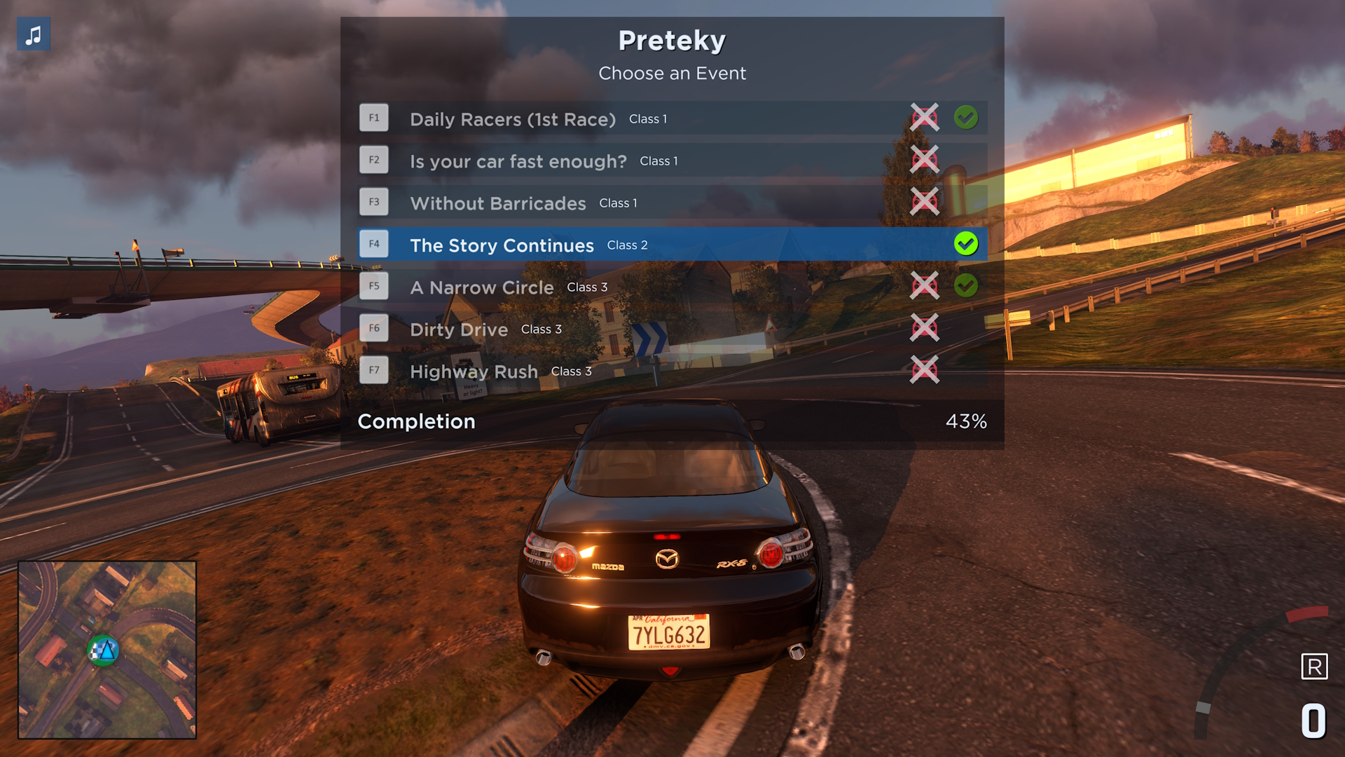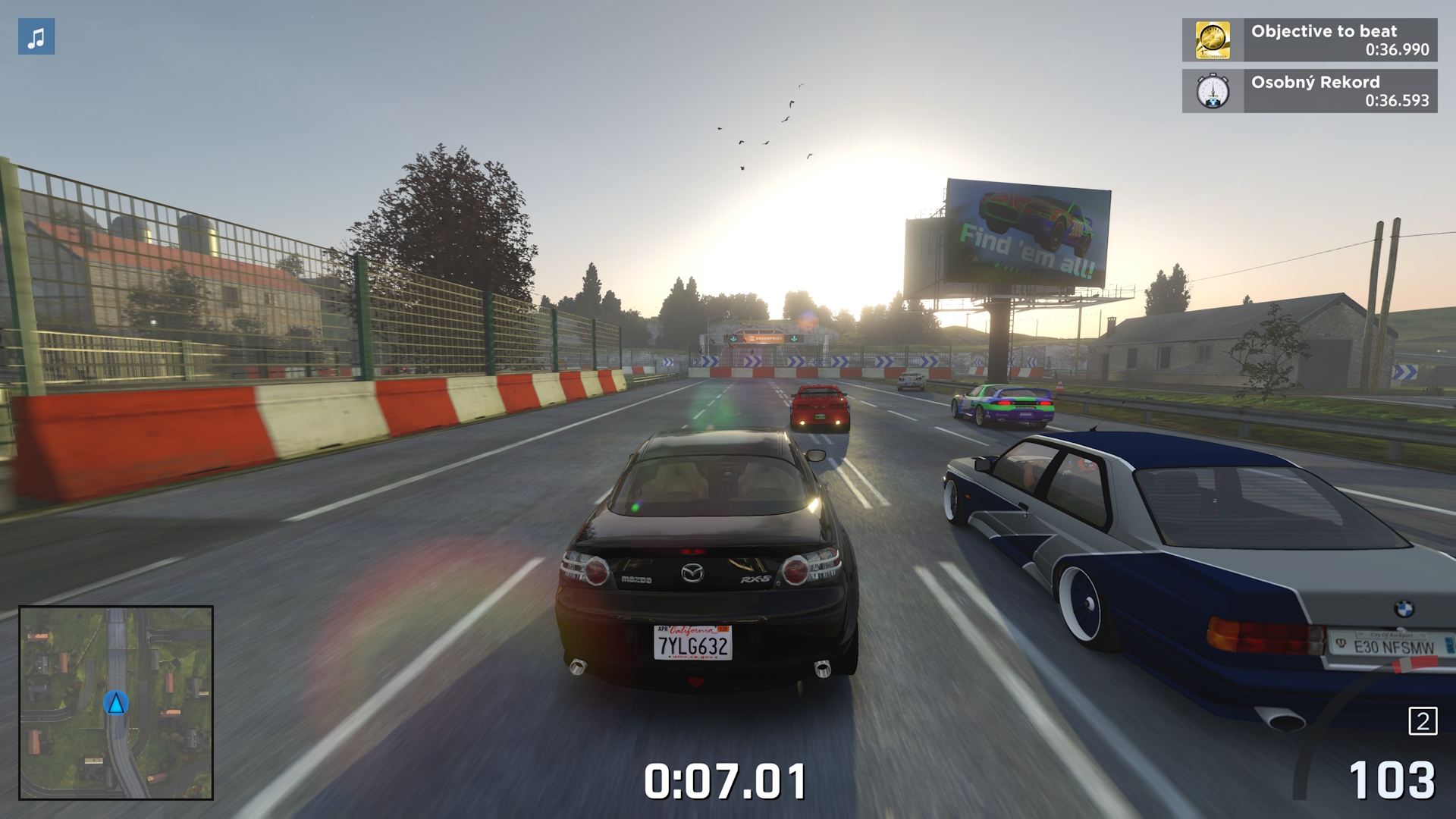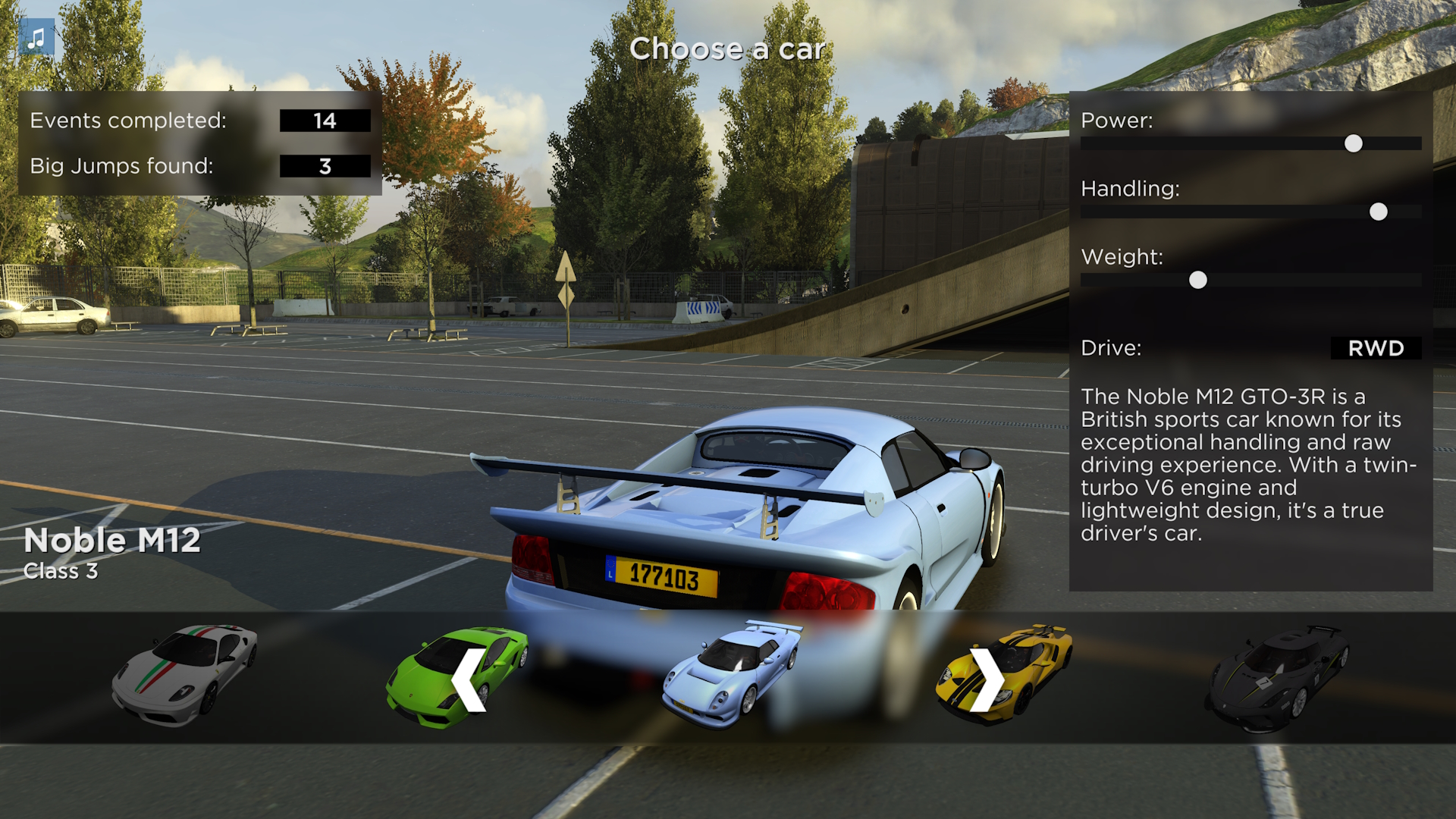 The main objective is to find and complete all events and unlock all cars. The cars are from Maniapark and each of them has different physics.